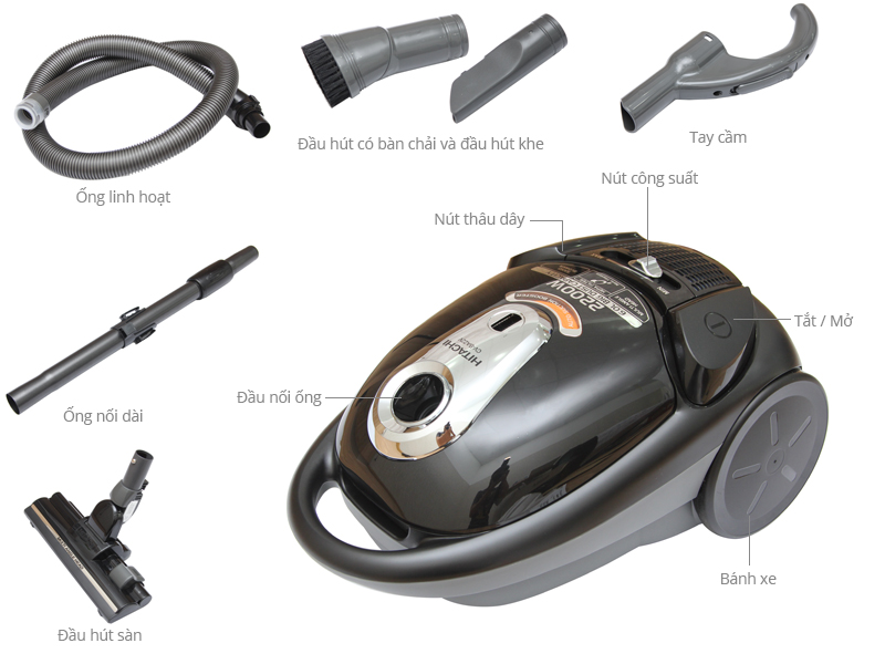 Với đầu hút sàn xoay linh hoạt, đầu hút khe và bàn chải quét bụi, đáp ứng mọi nhu cầu lau dọn của người sử dụng.