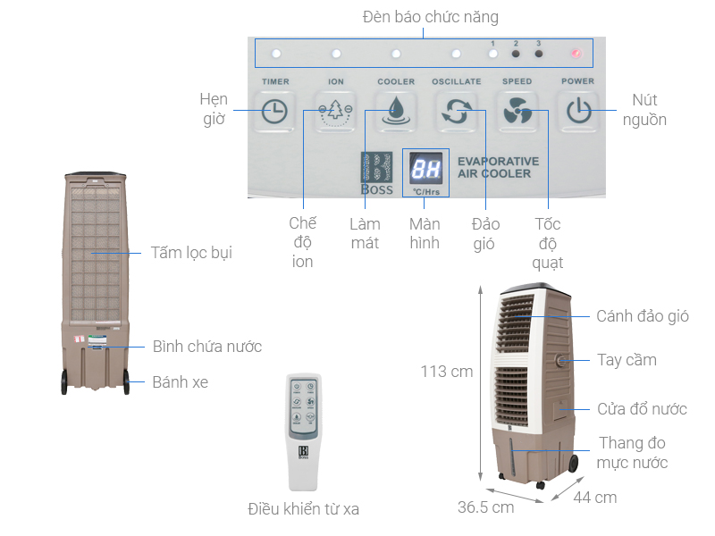 Quạt điều hòa Boss thiết kế trang nhã (hay còn gọi là quạt hơi nước), tinh tế, có bánh xe tiện cho việc di chuyển quạt đến các địa điểm sử dụng khác nhau